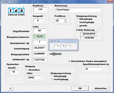 • Steigungshöhe (auch bei mehrgängigen Fräsern) HF, FHF, linke und rechte Flanke.